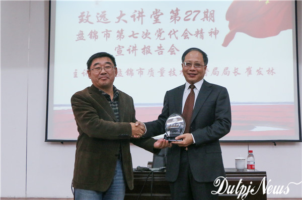 为贯彻落实盘锦市第七次党代会精神,把握市党代会精神实质,以大工红色基因助力盘锦创新发展,11月16日下午,校区党工委邀请到盘锦市质量技术监督局局长崔发林同志做客第27期致远大讲堂,为师生解读盘锦市第七次党代会精神。校区党工委副书记兼管委会副主任郭金明出席讲座,全体师生党员、积极分子参加报告会,研究院院长助理许建强副教授代表研究院出席。报告会由人力资源与党群工作部部长郈兵主持。