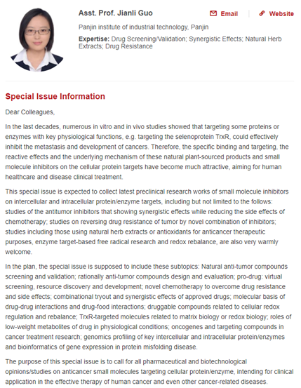 近期,研究院郭建丽博士领衔担任Frontiers in Bioscience-Landmark(影响因子,4.009)国际期刊客座编辑,组织特刊工作,特刊主题为“Screening, Designing, Molecular Mechanism and Pharmaceutical Application of Druggable Compounds Targeting Key Enzymes/Proteins In Relation to Human Health and Diseases”。这项工作的持续开展,有利于扩大盘锦市对外的社会知名度、有助于提升盘锦研究院的科技影响力和国际化形象、有益于积累学术办刊经验和增长创新实践力量。