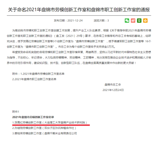 2021年12月24日,为推动盘锦市劳模和职工创新工作室创建发展,提升产业工人队伍素质,在各级工会推荐和市总工会考核的基础上,经研究决定,盘锦市总工会授予贺高红劳模创新工作室为“盘锦市劳模创新工作室”。