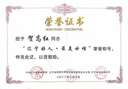 贺高红院长荣获 “辽宁好人•最美女性”荣誉称号; 贺高红院长获评“大连最美科技工作者” 荣誉称号;郭明钢荣获“盘锦市五一劳动奖章” 荣誉称号;闫志刚荣获盘锦市市直机关优秀共产党员荣誉称号;李冰璇荣获“盘锦市三八红旗手” 荣誉称号;张艳丽荣获“盘锦市妇联先进工作者”荣誉称号。
