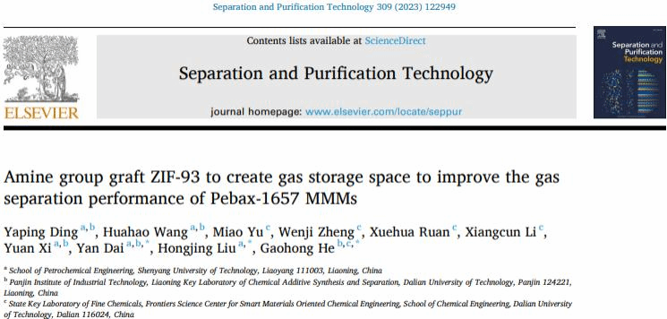 沈阳工业大学2020级联培硕士生丁亚萍为论文第一作者,代岩正高级工程师、刘红晶教授和贺高红教授为通讯作者。该文于2022年11月9日投稿,经过国际同行评审、实验补充、论文修订,于2022年12月15日被期刊最终接收,于2022年12月17日以全文形式在Separation and Purification Technology在线发表。
