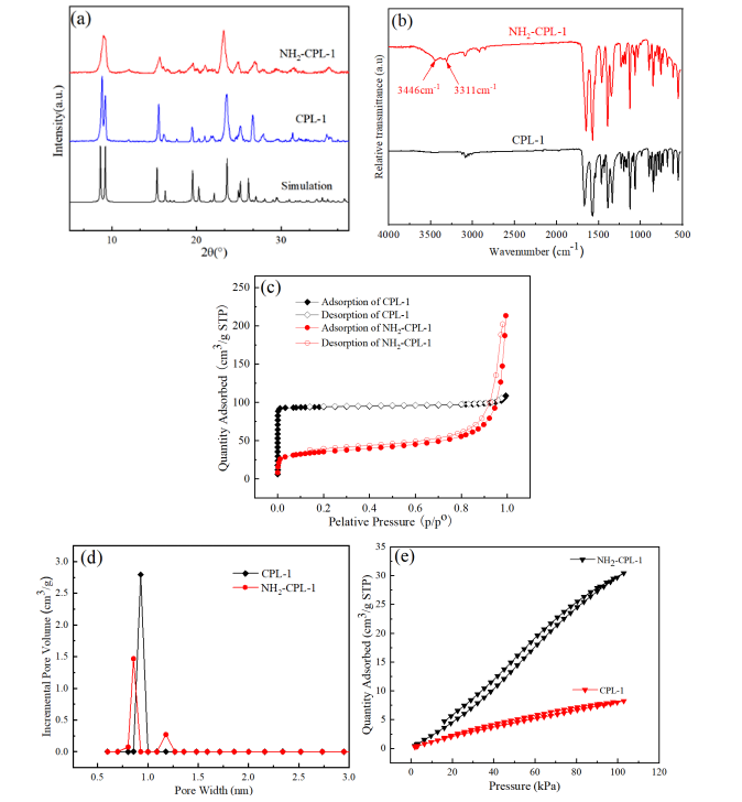 图2. CPL-1和NH2-CPL-1的 (a) X射线衍射谱图;(b) 红外光谱图;(c) N2吸附-脱附等温线;(d) 孔径分布;(e) 在298K下CO2吸附等温线