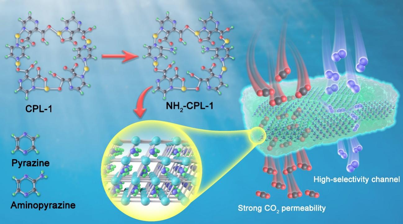(2)NH2-CPL-1被设计为用氨基吡嗪代替吡嗪配体在CPL-1中引入氨基。NH2-CPL-1的孔径从CPL-1中的0.93 nm减小到0.85 nm,这有利于CO2在N2上的筛选,提高了混合基质膜的扩散选择性。