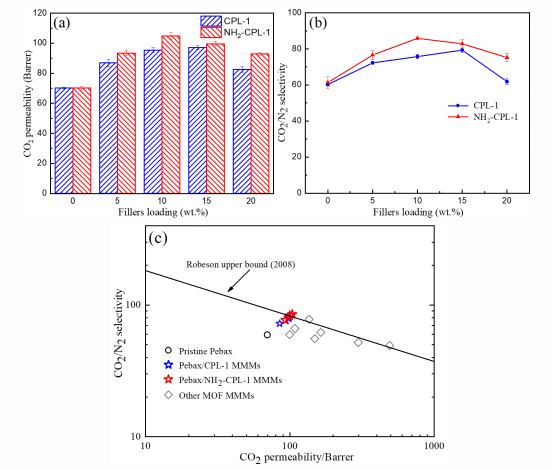 图4. (a) 不同填料负载的NH2-CPL-1/Pebax和CPL-1Pebax MMMs的CO2渗透性;(b) CO2/N2选择性;(c) NH2-CPL-1/Pebax MMMs的CO2/N2气体分离性能与罗布森上限的比较