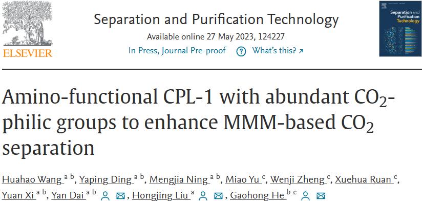 我院膜科学与技术研究室同沈阳工业大学及大连理工大学合作,近日于国际分离领域著名期刊 Separation and Purification Technology(JCR 1区Top,中科院工程技术1区Top,IF= 9.136)上发表了题为“Amino-functional CPL-1 with abundant CO2-philic groups to enhance MMM-based CO2 separation”的文章。该文章第一作者为我院联合培养硕士研究生王华浩,共同通讯作者为大连理工大学盘锦产业技术研究院代岩正高级工程师、沈阳工业大学刘红晶教授、大连理工大学贺高红教授。