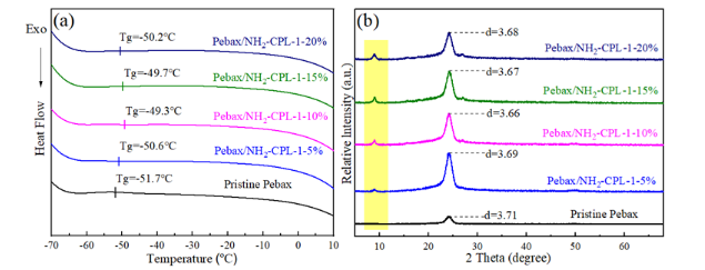 图3. NH2-CPL-1/Pebax混合基质膜的 (a) DSC表征图;(b) XRD表征图