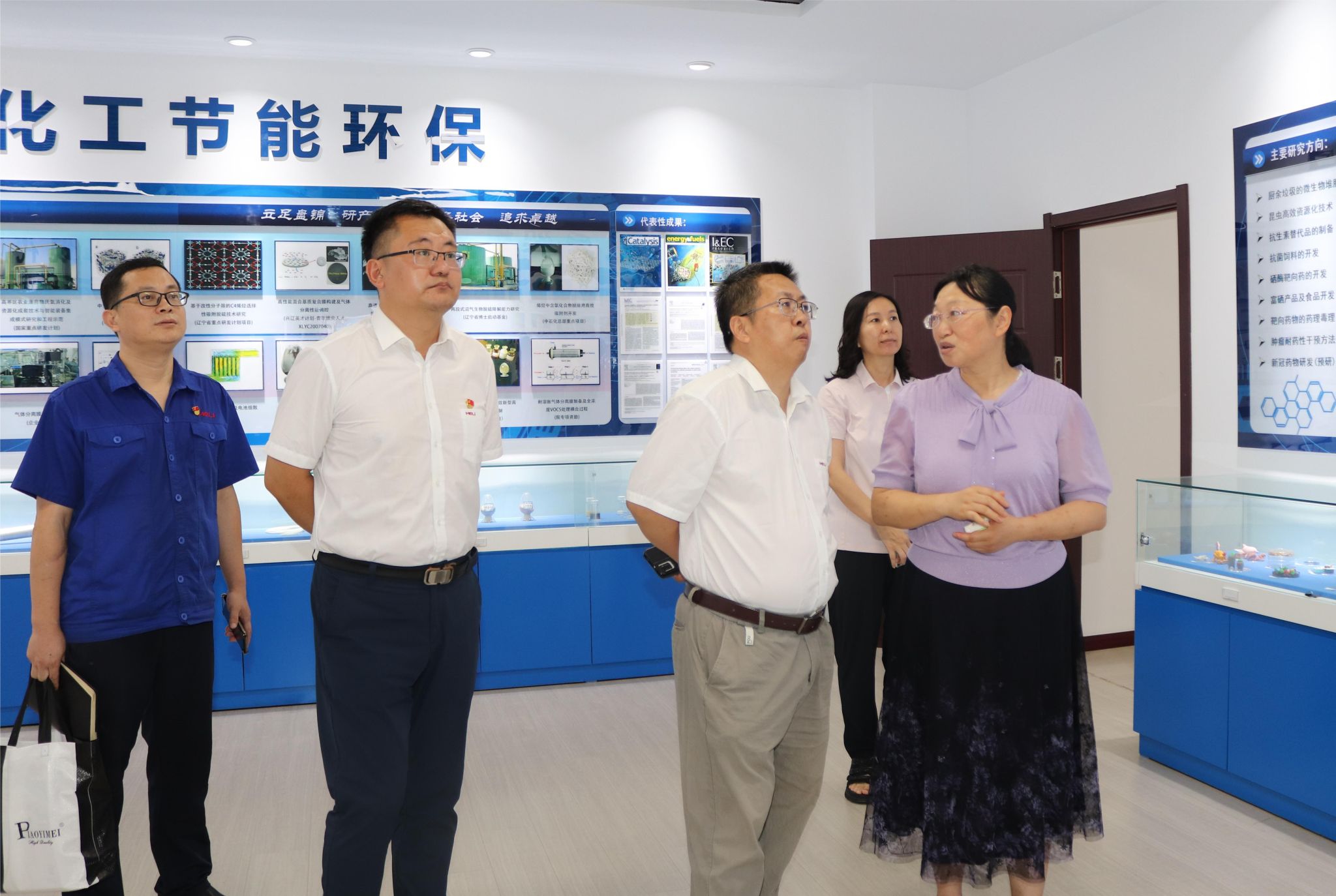 韩志刚一行在贺高红的陪同下参观了研究院展厅,了解了研究院在化工节能环保、高端装备、营养与微生态和现代服务四个重点领域开展的各项工作及取得的成果。