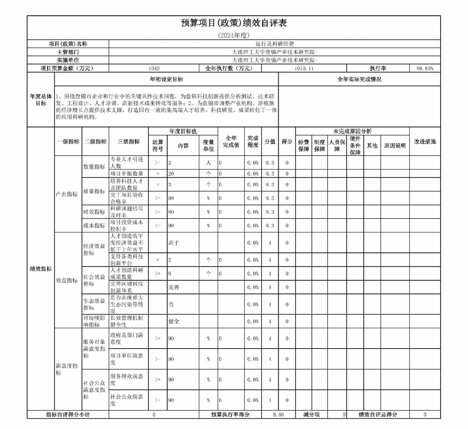 根据预算绩效管理要求,2024年度,大连理工大学盘锦产业技术研究院对本部门(单位)1个项目开展项目绩效自评工作,涉及资金1043万元,其中财政拨款资金1043万元,自评覆盖率(开展绩效自评的项目数/年初批复绩效目标的项目数*100%)达到100%,自评平均分(开展绩效自评的项目分数总和/开展绩效自评的项目数)96.85分。