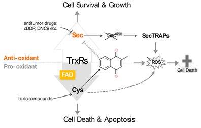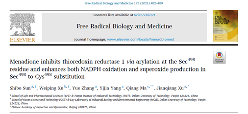 论文报道了硫氧还蛋白还原酶TrxR1的U498C突变以非硒依赖方式高效还原甲萘醌(Menadione)并大量产生超氧阴离子;同时甲萘醌芳基化野生型TrxR1高活性Sec498,并呈浓度依赖性地抑制还原反应。相较于谷胱甘肽还原酶(GR),TrxR1更有效地催化甲萘醌氧化还原循环。该研究进一步揭示了甲萘醌的生物学靶标和细胞毒性机理,为甲萘醌的临床应用前景和硒酶靶向抗肿瘤药物开发提供有益参考。硕士研究生孙世博为论文第一作者,许建强副教授为论文通讯作者。相关成果以原创研究论文形式(original research article)发表在主流期刊Free Radical Biology & Medicine(2021, 172:582-589.)。