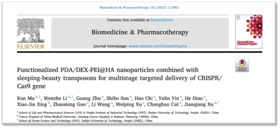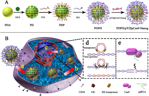 CRISPR/Cas9系统已经是现代精准医学和先进基因治疗方面重要而强大的基因编辑工具。为构建更安全的载体并促进基因组整合,课题组将CRISPR/Cas9基因与非病毒安全载体Sleeping-Beauty (SB)转座子联合使用,经分子克隆成功获得pT2SpCas9质粒DNA;同时以聚多巴胺(PDA)为载体,透明质酸(HA)为细胞靶向配体,地塞米松(DEX)为核定位信号(NLS),成功构建PDA/DEX-PEI@HA(PDPH)纳米颗粒,促进CRISPR/Cas9的精确靶向递送。实验结果显示PDA/DEX-PEI25k@HA/pT2SpCas9作为非病毒基因载体,具有进行CRISPR/Cas9传递和临床用药的巨大潜力。