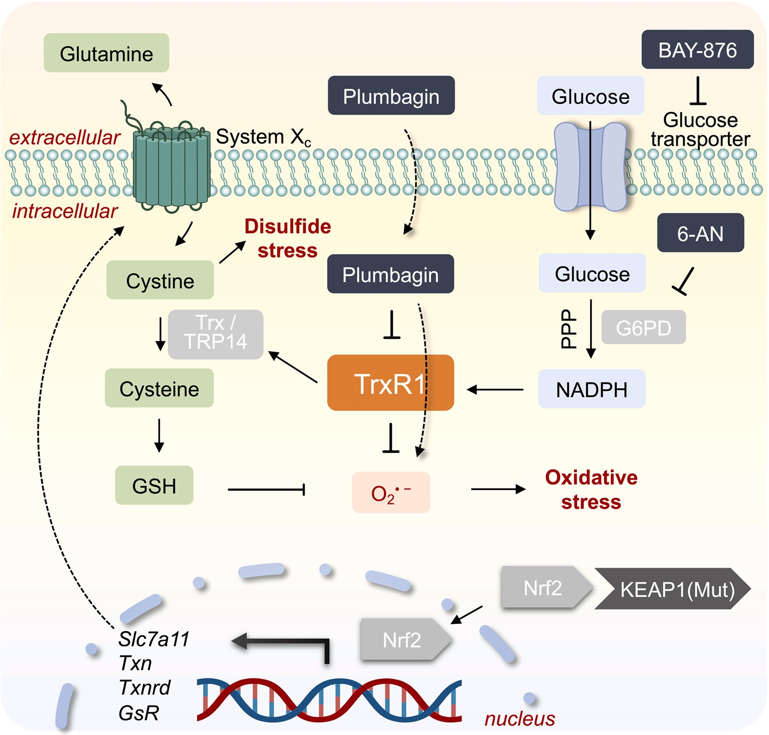 硫氧还蛋白还原酶(TrxR1)是生物体内氧化还原系统的重要组成部分,具有调节活性氧(ROS)和清除过氧化物的重要功能。兰雪醌(Plumbagin)可以通过抑制TrxR1活性,导致ROS依赖性细胞凋亡,从而导致癌细胞选择性死亡。然而,TrxR1介导兰雪醌氧化还原循环的机制尚不清楚,缺乏兰雪醌靶向TrxR1的证据。本研究系统阐述了兰雪醌靶向TrxR1的药理机制,并评估兰雪醌在非小细胞肺癌(NSCLC)中的治疗潜力,揭示兰雪醌与葡萄糖转运蛋白抑制剂BAY-876的协同作用。本研究将推动萘醌药物在非小细胞肺癌中的化疗应用,并为克服非小细胞肺癌(NSCLC)耐药性提供新的研究思路。