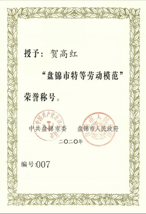 贺高红教授荣获“盘锦市特等劳动模范”。授奖单位:中共盘锦市委、盘锦市人民政府。