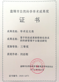 闫志刚获“盘锦市自然科学学术成果三等奖”。