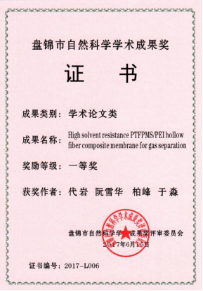 成果名称:《High solvent resistance PTFPMS/PEI hollow fiber composite membrance for gas separation》。
