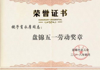 肖永厚获“盘锦五一劳动奖章”。授奖单位:盘锦市总工会。