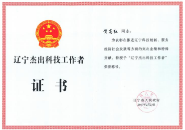 贺高红获“辽宁杰出科技工作者”荣誉称号。授予单位:辽宁省人民政府。