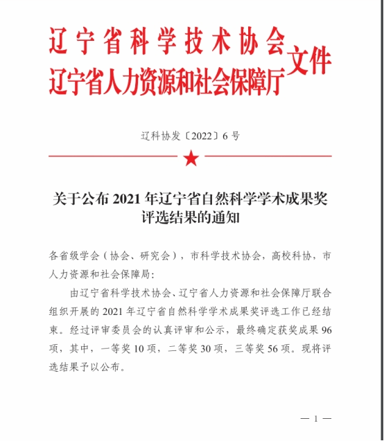 董文涛获“盘锦市自然科学学术成果一等奖”。