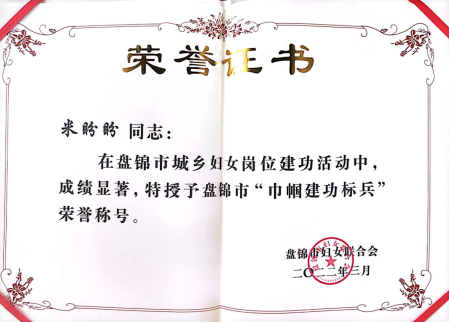 李玉善正高级工程师获“盘锦市巾帼建功标兵”,季凤云工程师获“盘锦市三八红旗手”荣誉称号