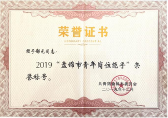 郗元获“盘锦市青年岗位能手”荣誉称号。授予单位:共青团盘锦委员会。