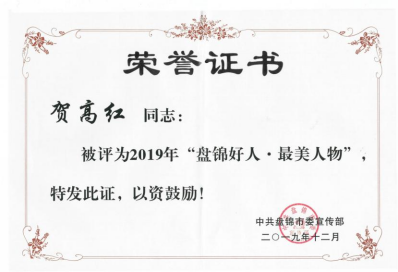 贺高红获“盘锦好人·最美人物”。荣誉称号。授予单位:中共盘锦市委宣传部。