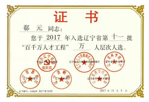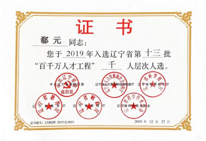 郗元入选辽宁省第十一批“百千万人才工程”万人层次。授予单位:辽宁省教育厅、共辽宁省委组织部、辽宁省财政厅、辽宁省人力资源和社会保障厅、辽宁省科学技术协会、辽宁省科学技术厅。