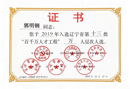 郭明钢入选辽宁省“百千万人才工程”万人层次。