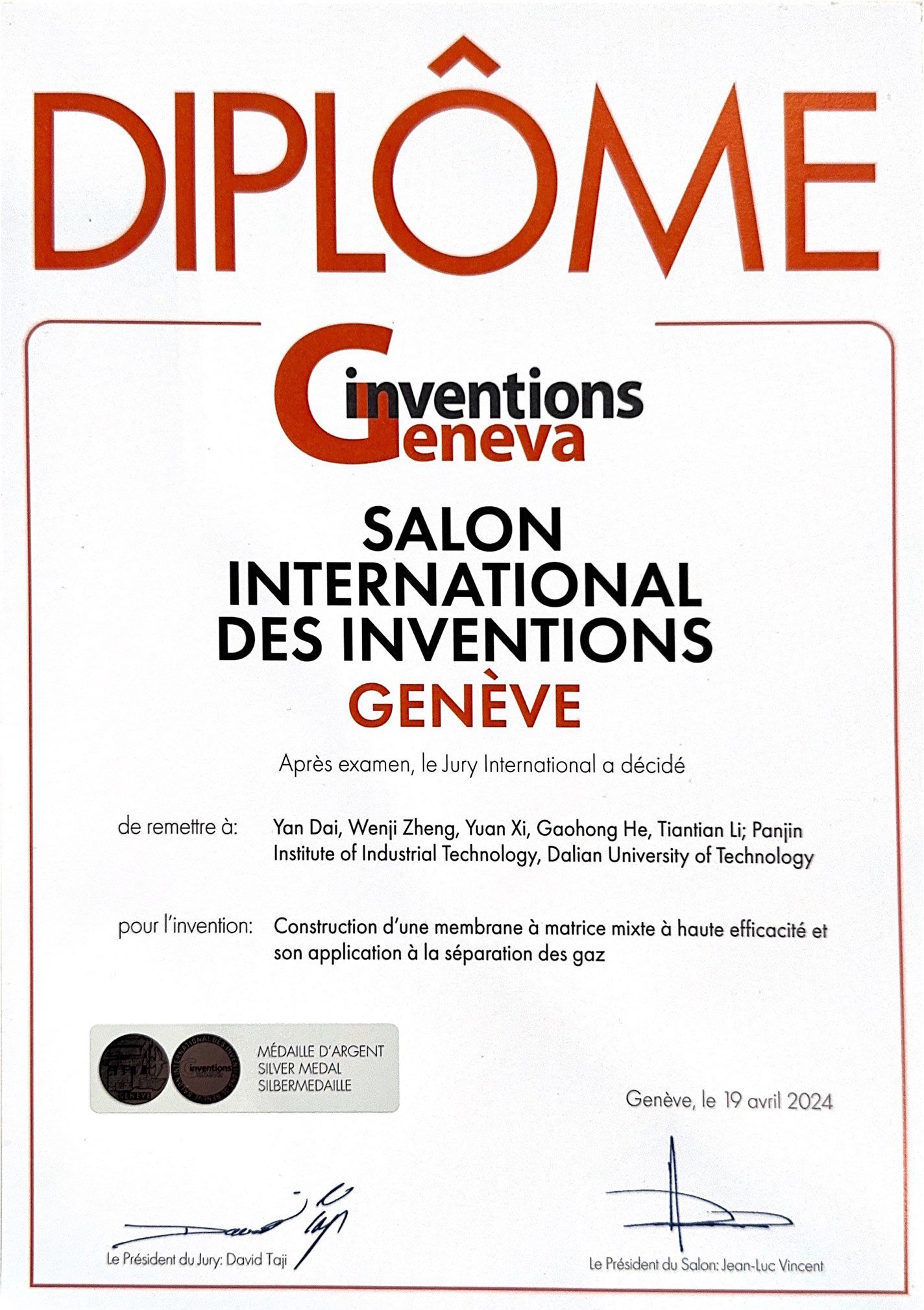 贺高红、代岩获第45届日内瓦国际发明展特别嘉许金奖。