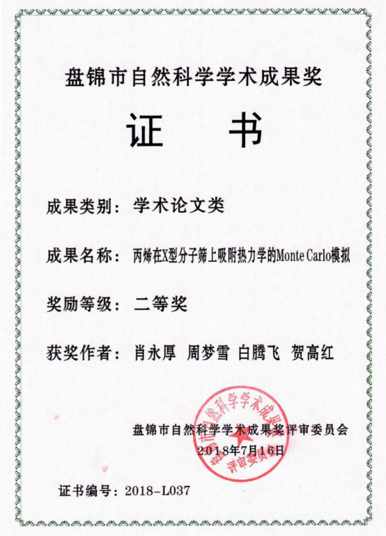 肖永厚获“盘锦市自然科学学术成果二等奖”。
