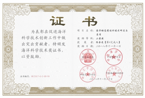 陈金龙获海洋科学技术二等奖。成果名称:海洋动态缆设计技术研究与应用。