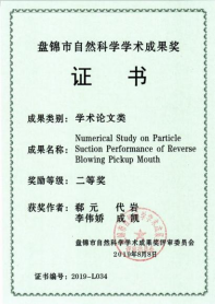 成果名称:Numerical Study on Particle Suction Performance of Reverse Blowing Pickup Mouth。