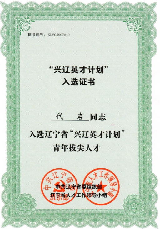 代岩高级工程师获评辽宁省“兴辽英才计划”青年拔尖人才,授予单位:辽宁省委组织部